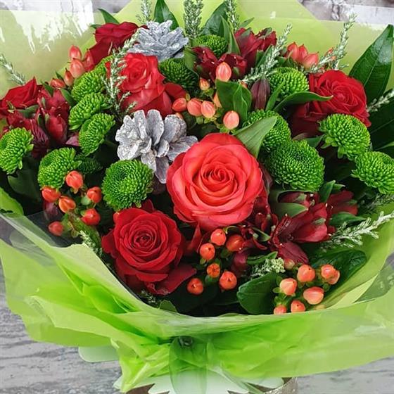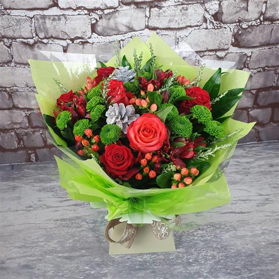 A festive Christmas arrangement filled with bold red roses, fresh winter greens, bright berries and sparkling pinecones. Designed with a warm seasonal style, perfect for adding colour and cheer to the holiday season.