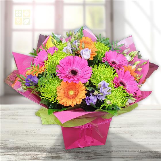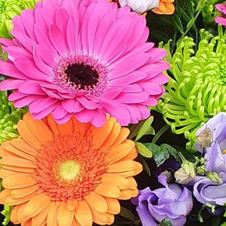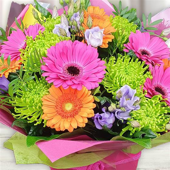 Fresh, vibrant, bold seasonal bouquet featuring hot pink and tangerine gerbera daisies, chartreuse spider chrysanthemums, delicate lavender lisianthus, crisp green hypericum berries and lush foliage, vibrant and bold.