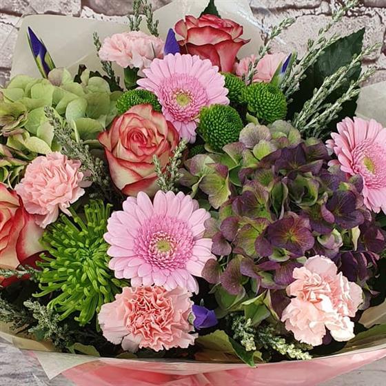 A soft festive display filled with pink gerberas, winter hydrangea, roses, carnations and fresh seasonal foliage. Warm blush tones mixed with deep evergreens give this bouquet a gentle Christmas feel, perfect for sending festive cheer with a modern twist.