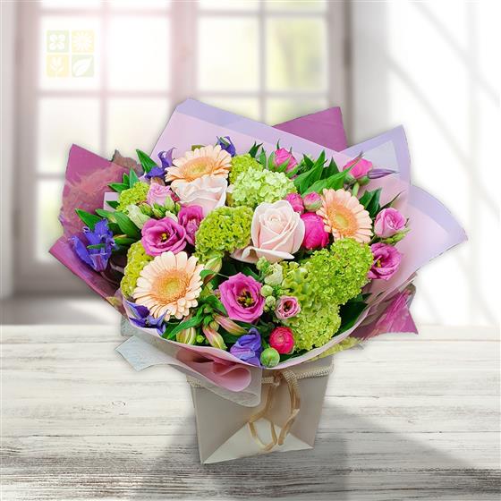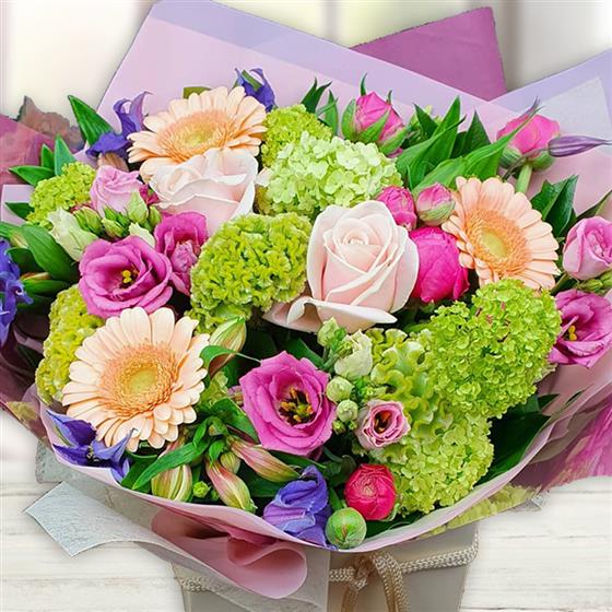 Delicate peach gerberas, pastel roses and lime hydrangea balls cluster alongside magenta lisianthus, lavender freesia and verdant leaves, wrapped in blush paper for whisper-soft elegance.