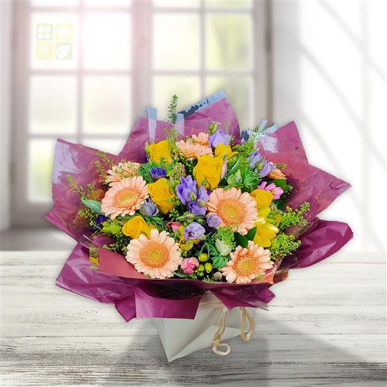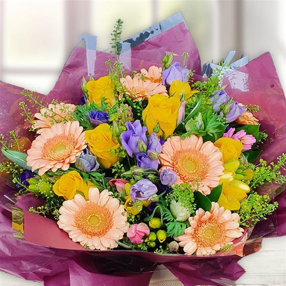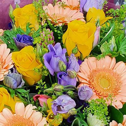 Peach gerberas, golden roses and violet lisianthus mingle with yellow freesias, lime viburnum and soft pink spray roses, nestled in lush greenery for a gentle, sunrise-inspired bloom.