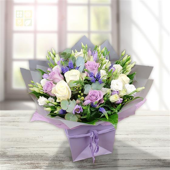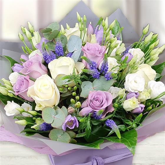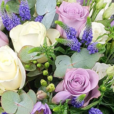 Pale lavender and ivory roses paired with white lisianthus, slender veronica stems and eucalyptus greenery for a dreamy, tranquil bouquet.