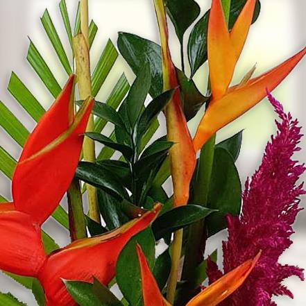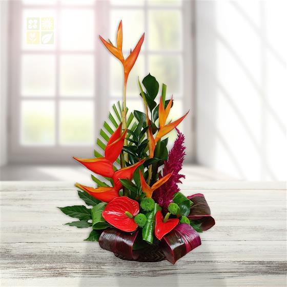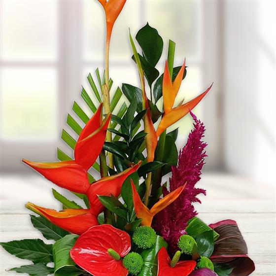 Design includes striking orange heliconia, sculptural red anthurium, vibrant green button chrysanthemums, rich celosia plume, tropical foliage and folded leaf accents, arranged into a dramatic, contemporary display with height, movement and strong architectural impact.