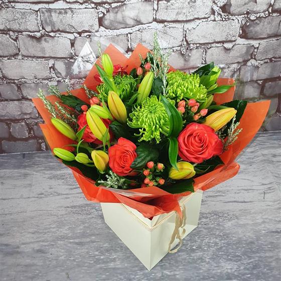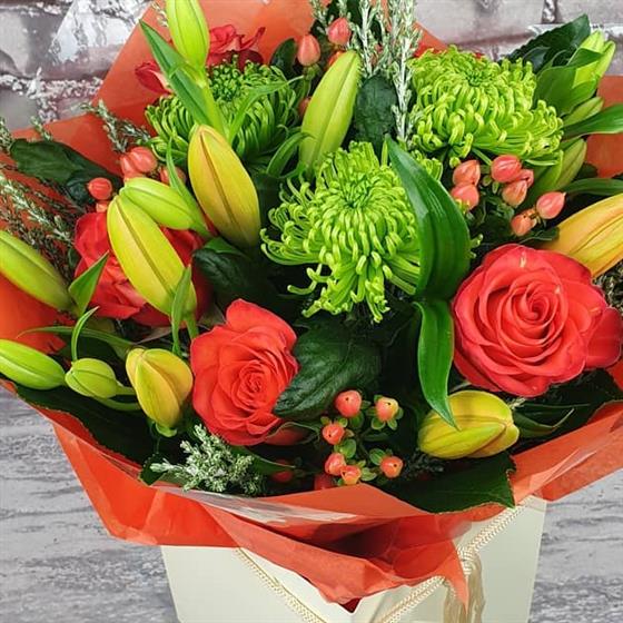 A warm and vibrant Christmas arrangement filled with bright orange roses, fresh green blooms and seasonal berries. Designed in a cheerful festive style, perfect for bringing colour, warmth and celebration to the holiday season.