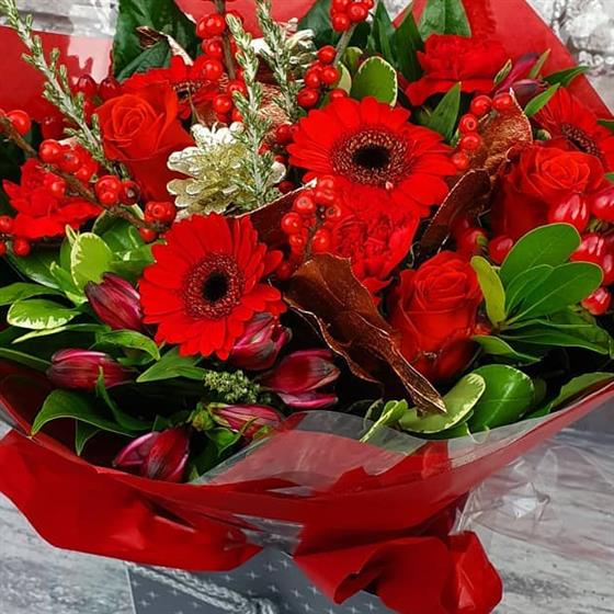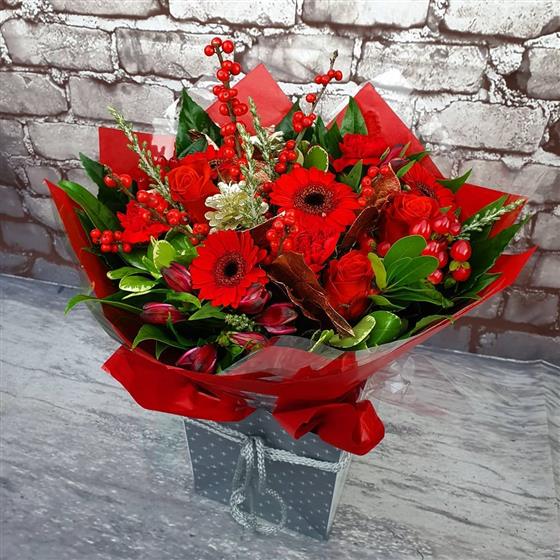 A bold festive arrangement filled with rich red blooms, glossy winter foliage, vibrant berries and shimmering seasonal touches. Designed to bring instant Christmas warmth and colour to any home this season.