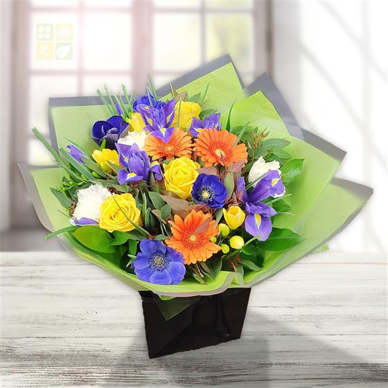 Vibrant mix of golden roses, bright orange gerberas, vivid blue anemones, crisp white carnations, and delicate yellow freesias set against lush greenery bold, cheerful elegance wrapped in paper.