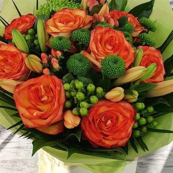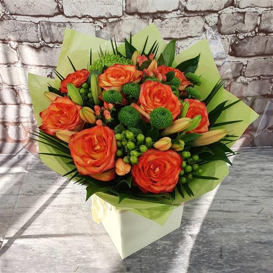 A warm Christmas arrangement filled with glowing orange roses, fresh winter greens and soft seasonal accents. Designed with a bright festive style, perfect for adding colour and cheer to the holiday season.