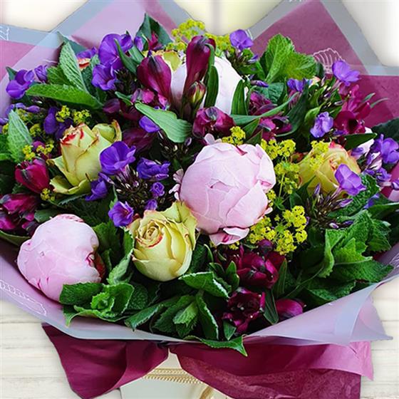 This bouquet features soft pink peony, cream and crimson roses, deep burgundy alstroemeria, purple stock, golden yarrow and fresh mint foliage—elegantly wrapped in paper for a gently enchanting gift.