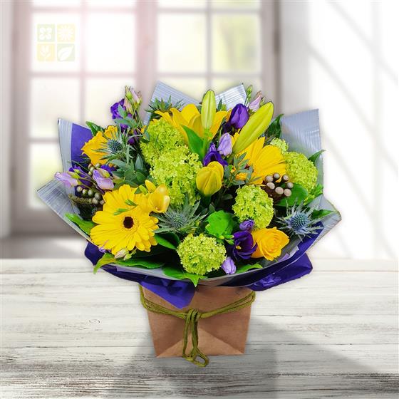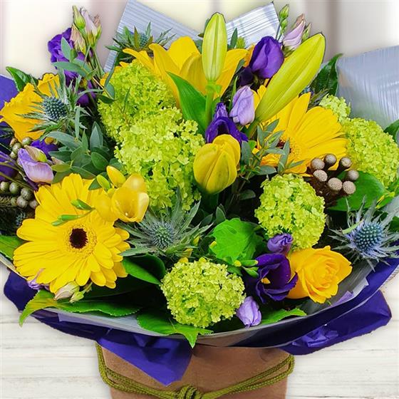 Delicate yellow tulips and Asiatic lilies pair with golden gerberas, chartreuse viburnum, blue eryngium and purple lisianthus for a subtle, radiant gift.