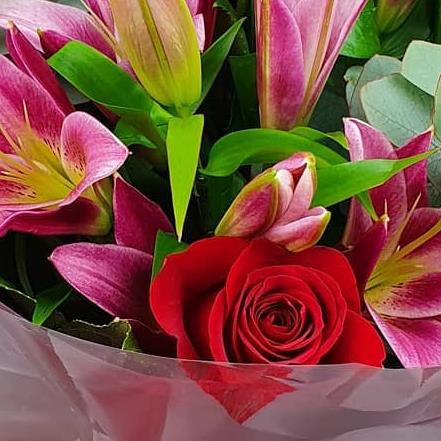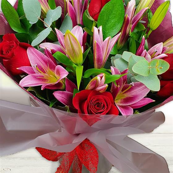 Design includes pink oriental lilies at various stages of bloom, classic red roses, eucalyptus foliage and fresh green leaves, brought together in a striking bouquet that balances bold colour with soft texture and natural movement.