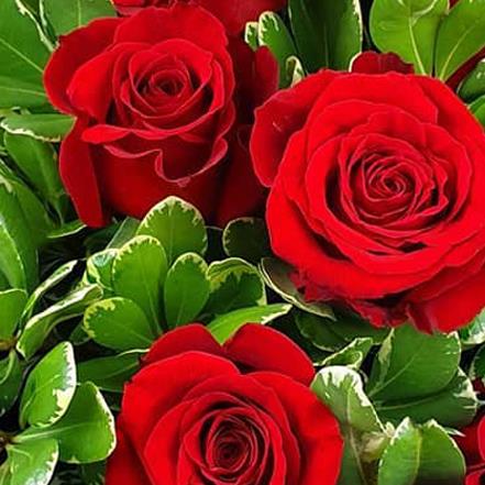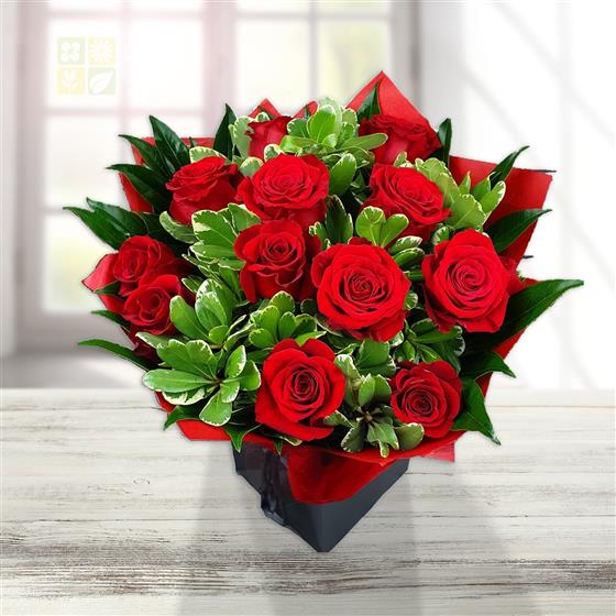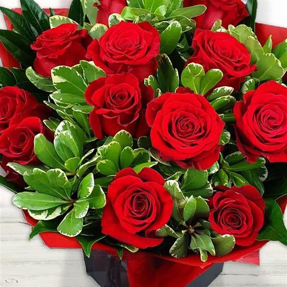 Design includes classic red roses arranged with glossy variegated foliage and rich green leaves, creating a strong, timeless bouquet with deep colour, clean lines and confident, elegant impact.