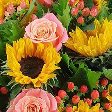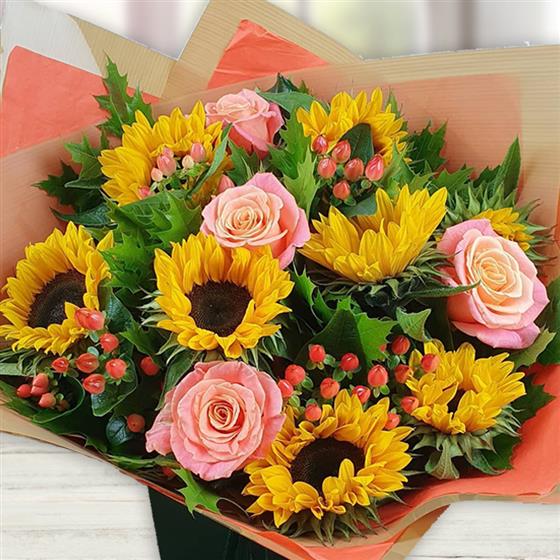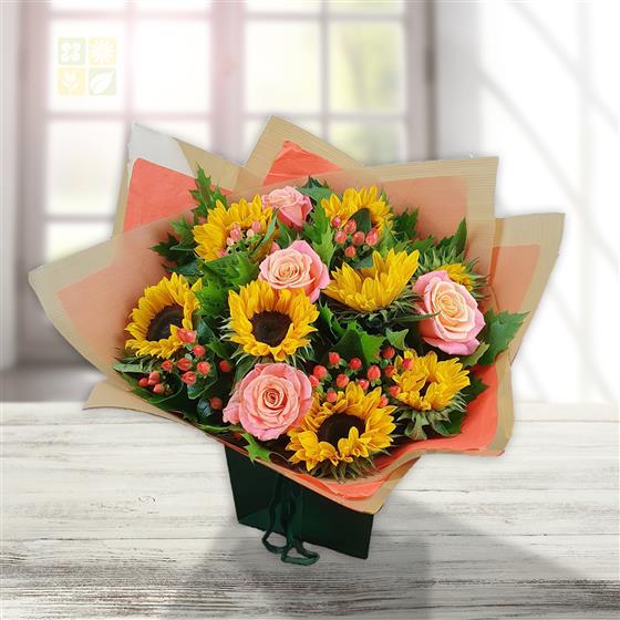 Sunny sunflower blooms, pastel pink roses and coral hypericum berries nestled in verdant foliage create a softly vibrant bouquet that whispers warm morning light.
