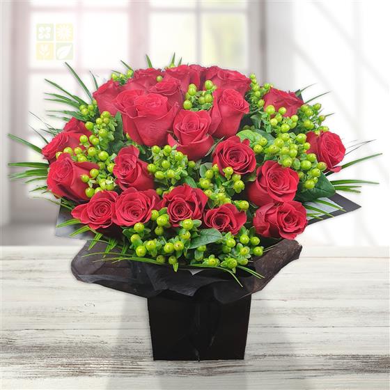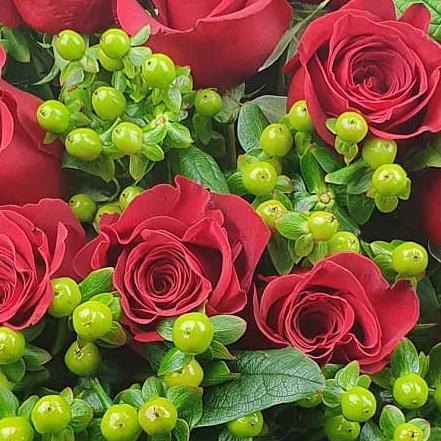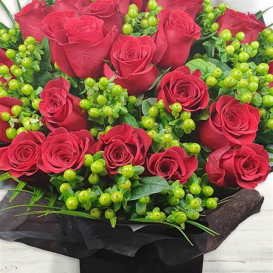 A striking, full-bodied flower bouquet built around rich red roses and fresh green berries. Balanced, confident and timeless, this design delivers impact with depth and clean structure.