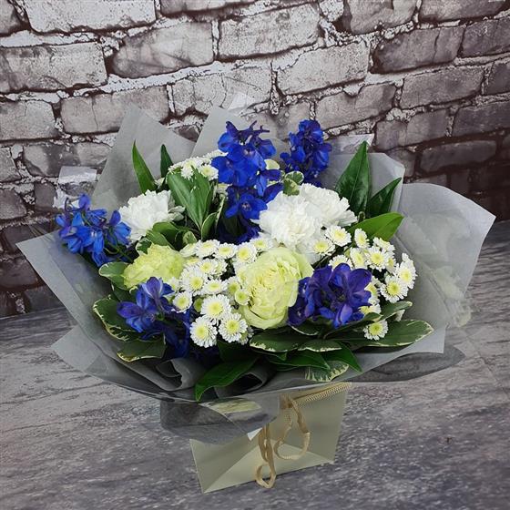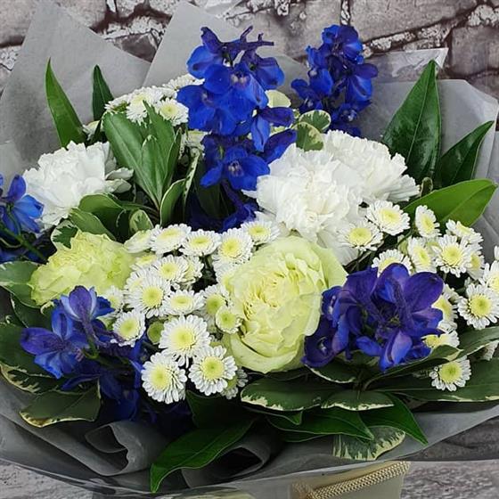 A cool and elegant Christmas arrangement filled with winter whites, soft creams and rich blue blooms, arranged with fresh seasonal foliage. Designed in a frosty festive style, perfect for bringing a touch of winter magic to the season.