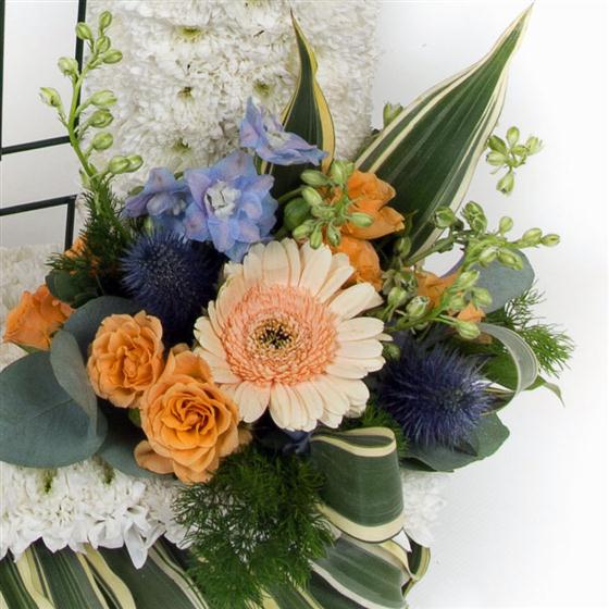 A massed tribute of white chrysanthemums with sprays available as pictured, in peaches and blues, or in your choice of colour.