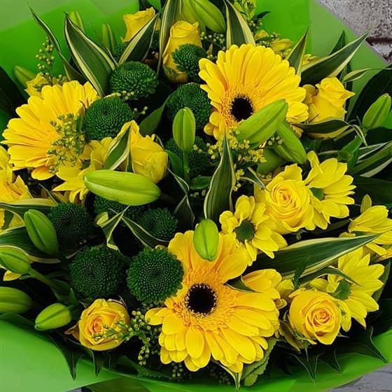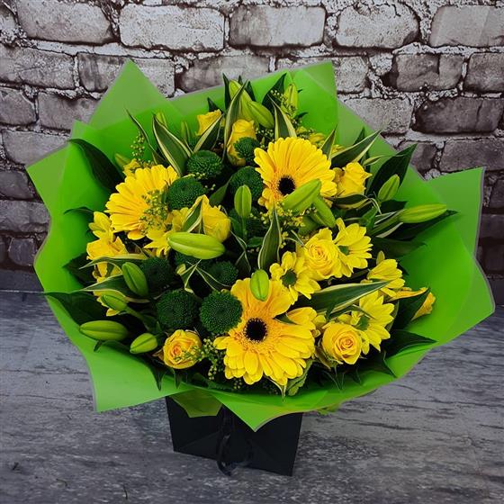 A bright and joyful Christmas bouquet bursting with golden blooms, fresh winter greenery and uplifting seasonal colour. Designed to bring warmth, cheer and a glowing festive welcome into any home this holiday season.