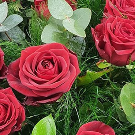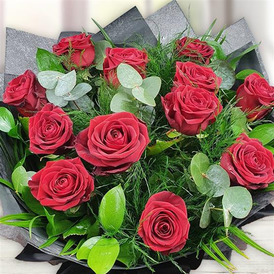 Soft crimson roses accentuated by feathery asparagus fern and tender eucalyptus, tied with paper wrap for whisper-soft luxury.