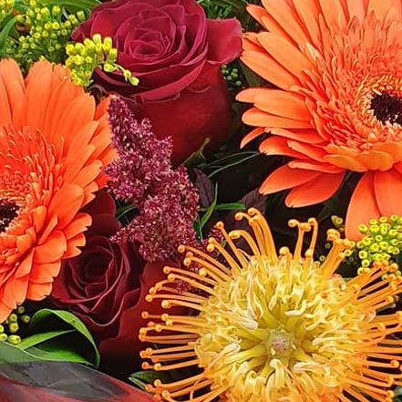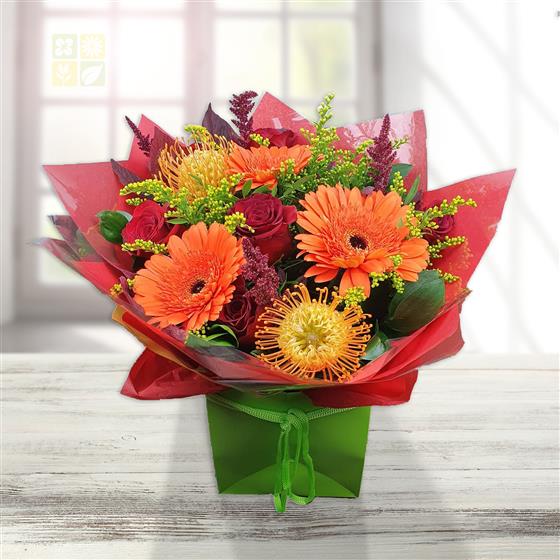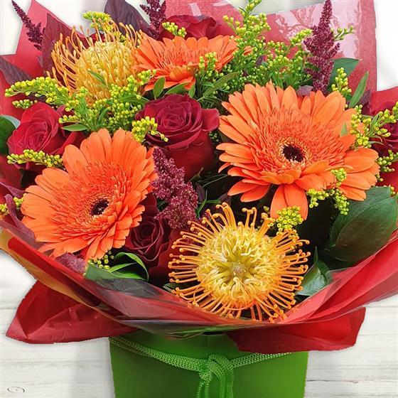 Design includes vibrant orange gerbera, rich red roses, striking pincushion protea, textural seasonal fillers, fresh green accents and glossy foliage, arranged into a lively bouquet packed with warmth, contrast and eye-catching, feel-good colour.
