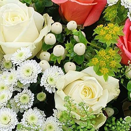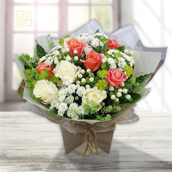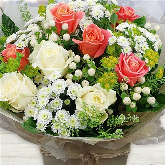 Lovely arrangement of fragrant creamy white roses, coral roses, pure white spray chrysanthemums, hypericum berries, and green alchemilla, nestled in lush foliage—wrapped in elegant paper for timeless, refined charm.