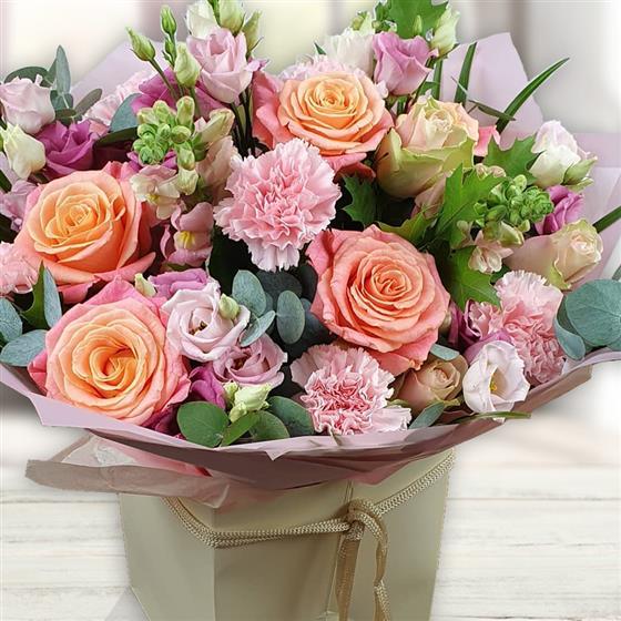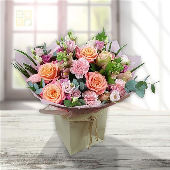 A charming gathering of blush roses, ivory lisianthus and fern-green foliage, tied with a ribbon. Subtle, sweet and perfect that soothes the soul with every delicate bloom.