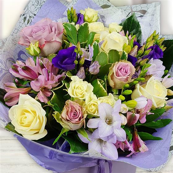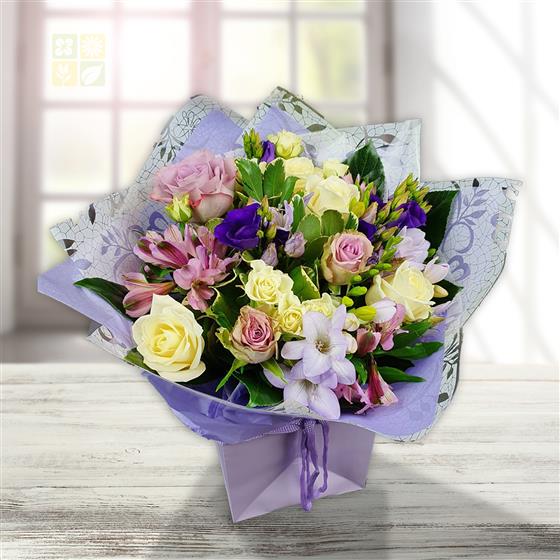 Delicate bouquet of blush garden roses, ivory roses, purple lisianthus, pink alstroemeria and lush green foliage, elegantly wrapped in paper, perfect soft timeless elegance.