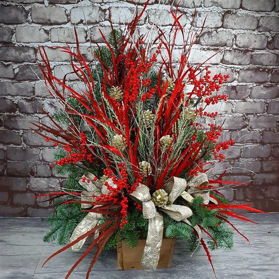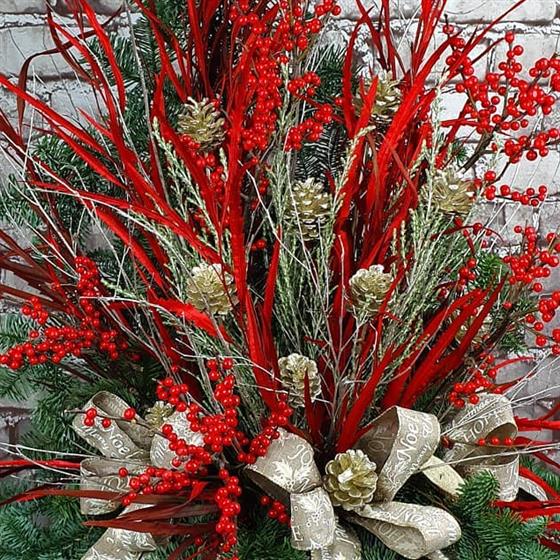 A bold Christmas arrangement filled with rich evergreens, red berries and festive textures. Designed for instant seasonal impact with natural detail and elegant style using fresh flowers and foliage.