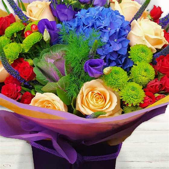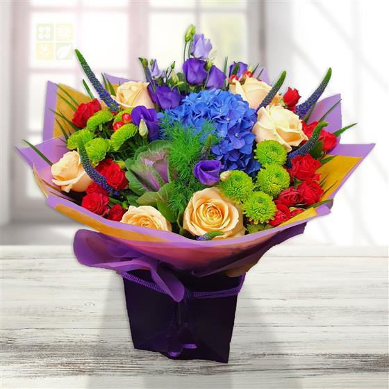 A bold flower bouquet built around strong colour contrast and texture, combining hydrangea, roses and vibrant seasonal blooms. Designed to feel lively and expressive, this arrangement delivers impact and depth from every angle.