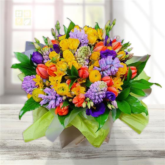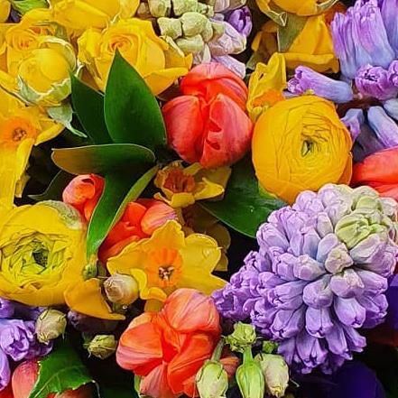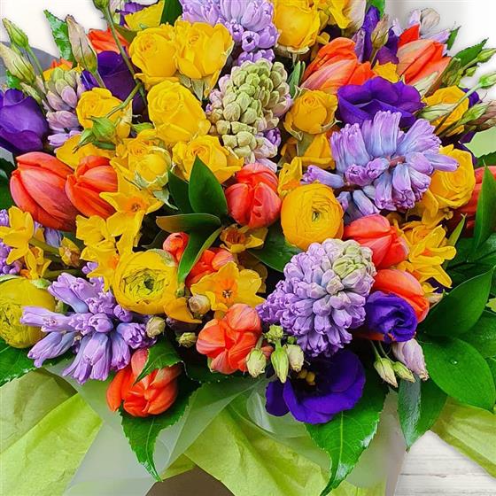 A vibrant mixed flower arrangement featuring spray roses, tulips, hyacinths, lisianthus and seasonal spring blooms, layered with fresh green foliage. Packed with bold colour, texture and energy, designed for a bright, uplifting finish.