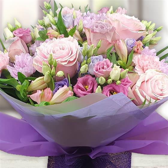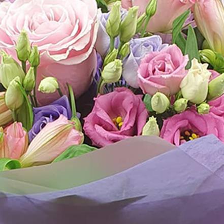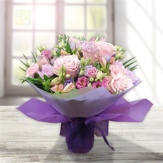 Soft pink roses, fluffy hydrangea and delicate carnations mingle with lilac lisianthus and lilies framed by palm fronds for a gentle, garden-inspired bouquet.
