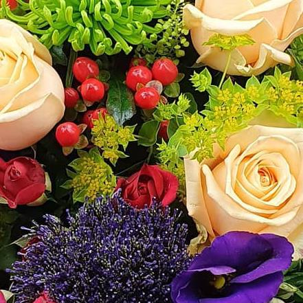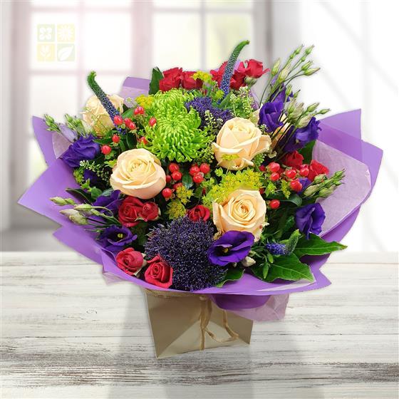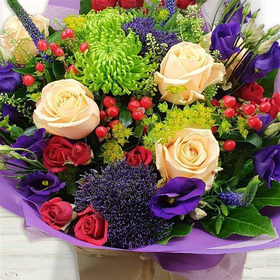 Design includes soft peach roses, rich purple lisianthus, green chrysanthemum, vibrant red spray roses, blue thistle, hypericum berries and mixed foliage, creating a lively bouquet full of colour, texture and playful contrast.