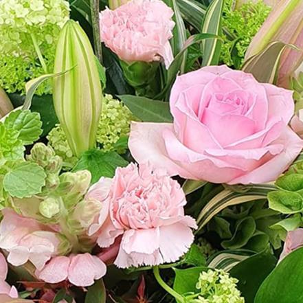 A pastel garden including lilies, blush roses, pale pink carnations, lilac spray roses and chartreuse bells of Ireland woven with variegated dracaena and eucalyptus for whisper-soft spring elegance.