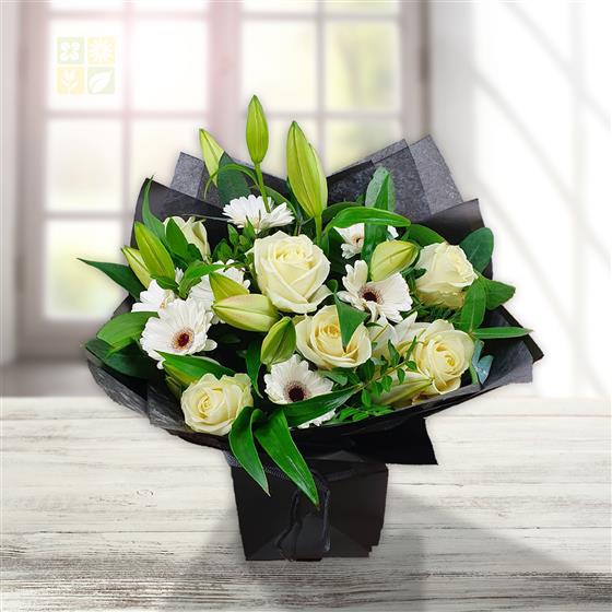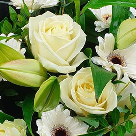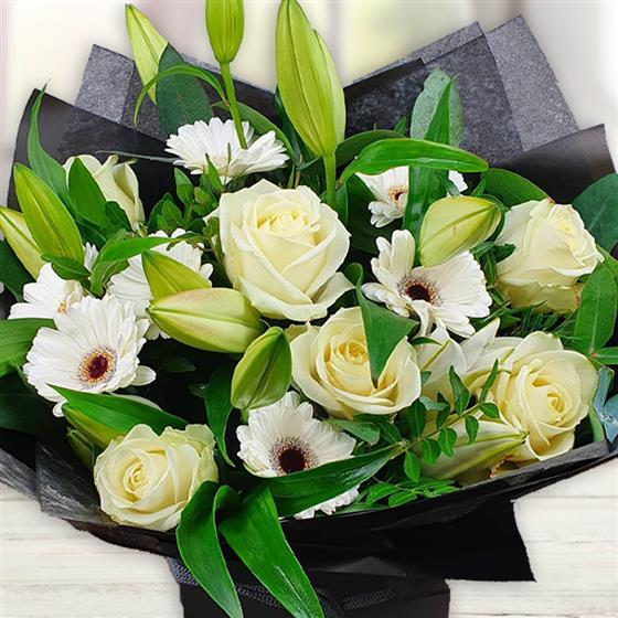 Whisper-soft white roses, lilies and pure gerberas nestled in lush green leaves, wrapped in paper for serene beauty.