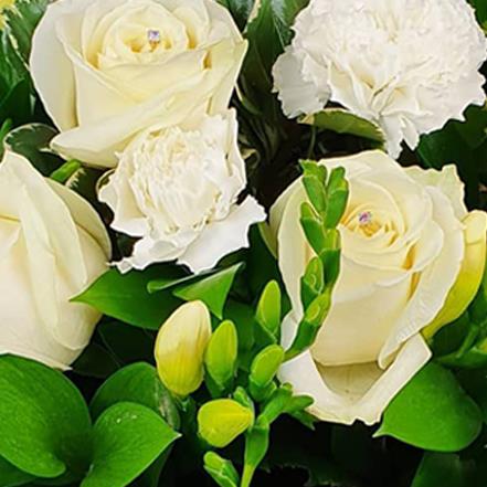 Creamy ivory roses, delicate white carnations and pale freesia blooms entwine with glossy leaves in a minimalistic wrap for understated, timeless beauty.