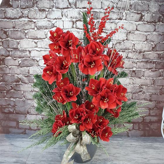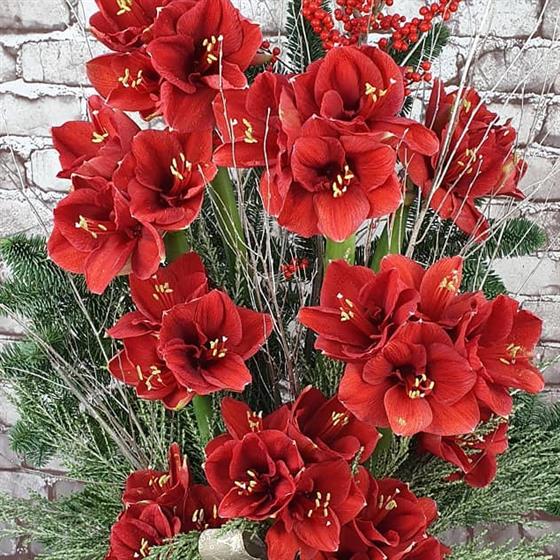 A spectacular Christmas display filled with luxurious red amaryllis, fresh winter foliage and festive berries. Designed in a grand seasonal style, perfect for adding elegance and celebration to the holiday season.