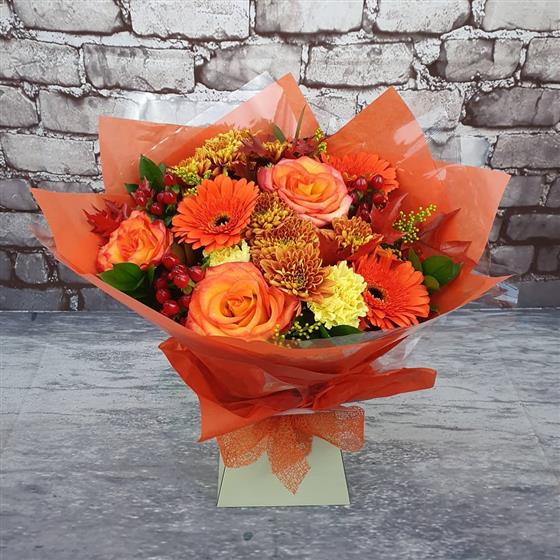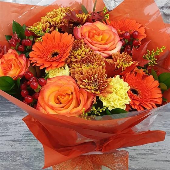 A glowing Christmas arrangement bursting with warm oranges, golden tones and festive berries, arranged using fresh seasonal flowers and natural festive style. A bright and cheerful design perfect for the holiday season.