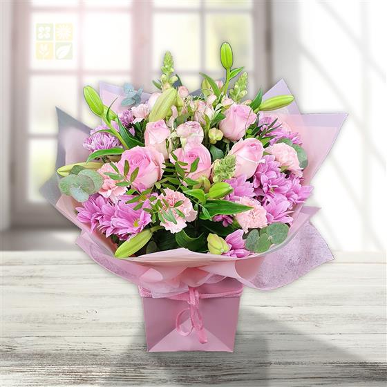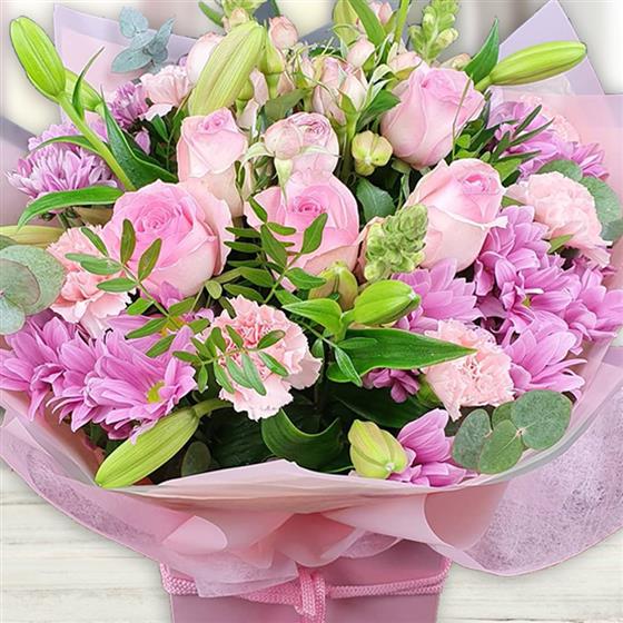 Whisper-light lilies and pink snapdragons rise above blush roses, dainty carnations and gentle chrysanthemums, tied together with eucalyptus and lush greenery for a dreamy, poetic bouquet.