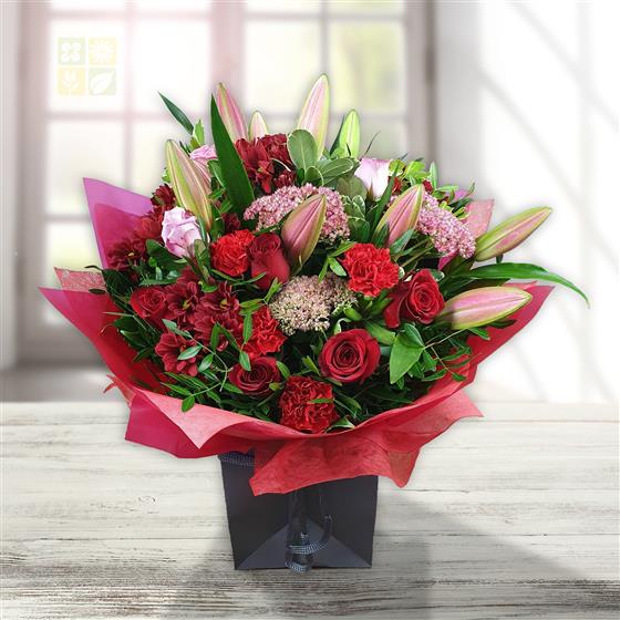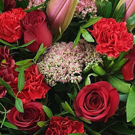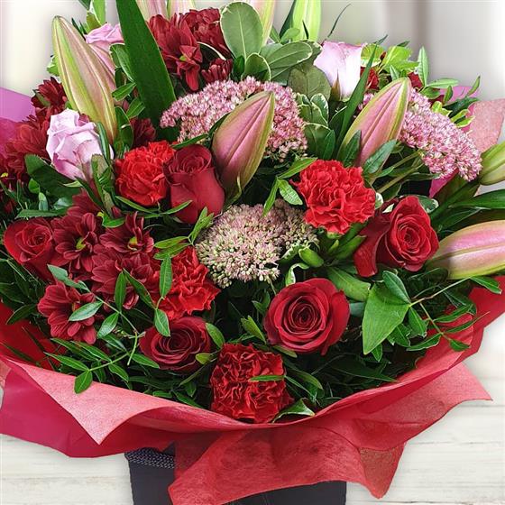 Deep red roses, rich carnations and ruby chrysanthemums mingle with pale pink lilies and tender sedum blooms, all nestled in soft foliage for a warm, elegant expression of love.
