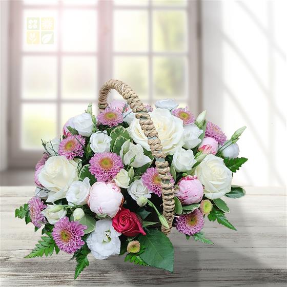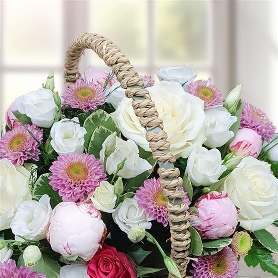 Ivory garden roses, delicate pink peonies and white lisianthus accented by soft pink spray mums in a charming basket, delivering a whisper-soft touch of spring elegance.