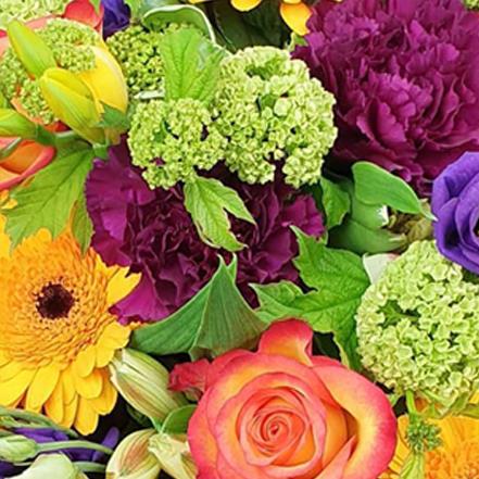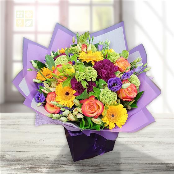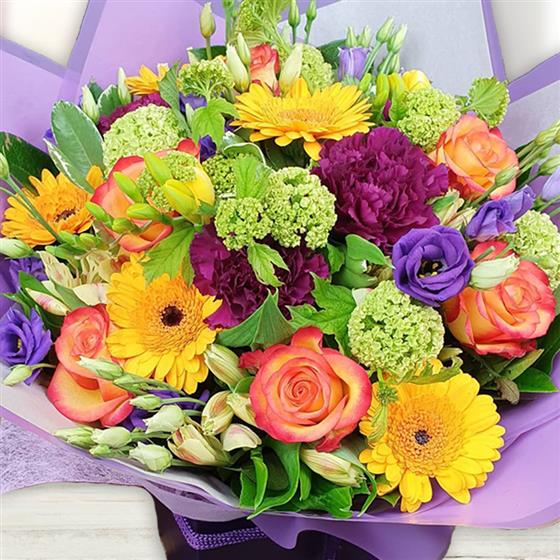 Radiant bouquet bursting with summer colour, featuring golden gerberas, coral bicolour roses, burgundy carnations, purple lisianthus, lime viburnum and creamy alstroemeria, nestled in mint foliage and wrapped in paper.