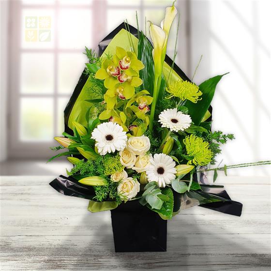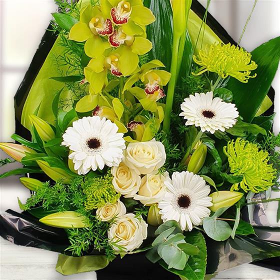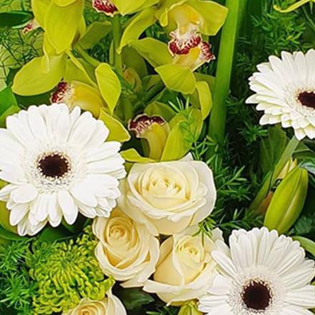 Vibrant ivory gerberas, creamy white roses, elegant calla lilies, exotic green cymbidium orchids, chartreuse spider chrysanthemums, lilies and lush green foliage.