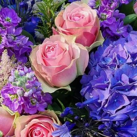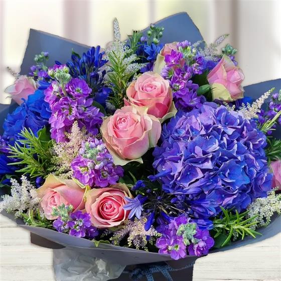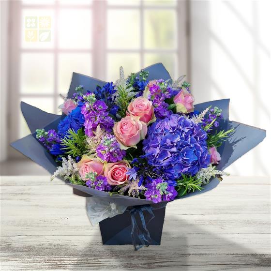 Celebrate in style with vibrant blue hydrangeas, blush-pink roses, purple stock, striking blue agapanthus, delicate astilbe and aromatic rosemary, all elegantly presented in a chic gift box, perfect for any joyous occasion.