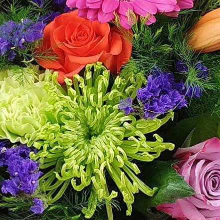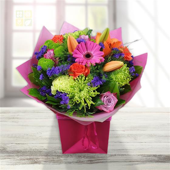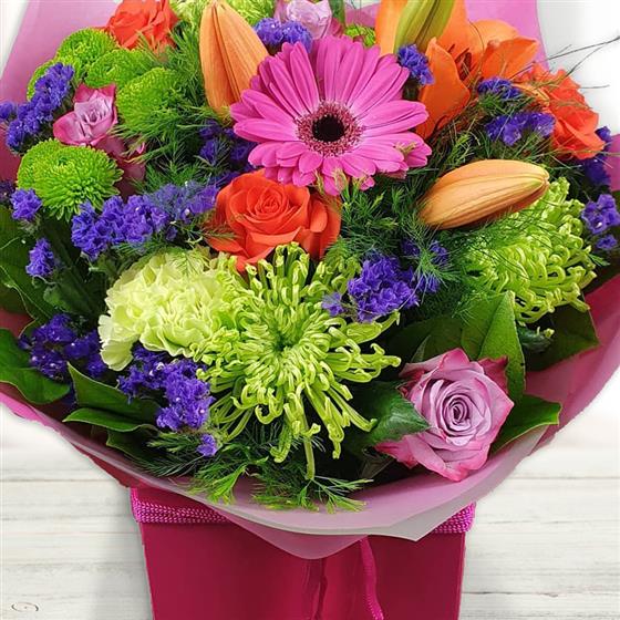 A bold and cheerful flower bouquet combining vibrant pinks, fresh greens and warm orange tones. Designed with gerbera, roses and lilies, finished with textured blooms and foliage for a lively, eye-catching display.