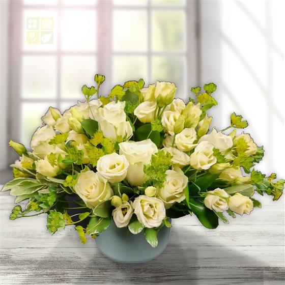 Ivory roses and creamy lisianthus nestle among chartreuse viburnum clusters and lush greenery for a whisper-soft arrangement that soothes with gentle, serene elegance.