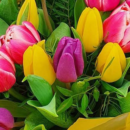 Design includes mixed pink, purple and yellow tulips arranged with fresh green foliage, creating a bright, uplifting bouquet full of spring colour, clean lines and natural freshness.