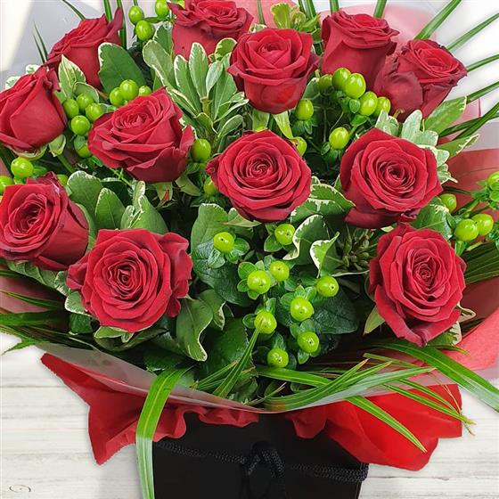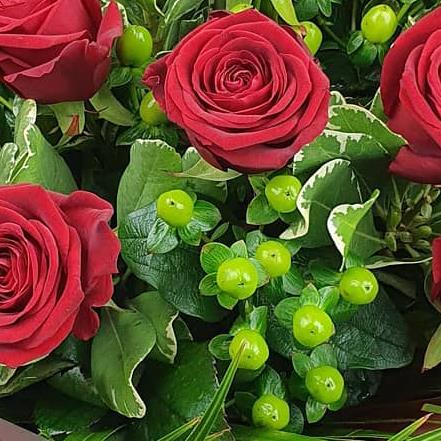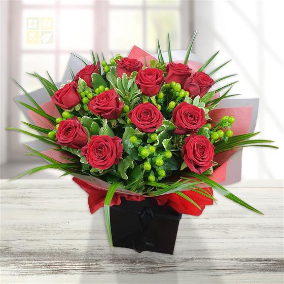 A structured flower bouquet built around rich red roses, balanced with glossy green berries and crisp foliage. Clean lines and strong colour contrast give this arrangement a confident, contemporary presence with lasting impact.