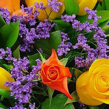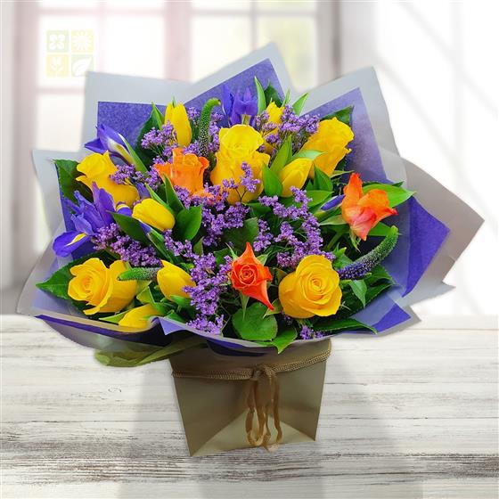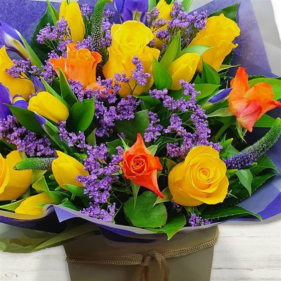 Design includes yellow and orange roses, purple iris, yellow tulips, lilac statice, textured green accents and fresh foliage, arranged into a vibrant bouquet with bold colour contrasts, layered texture and a lively, uplifting feel.