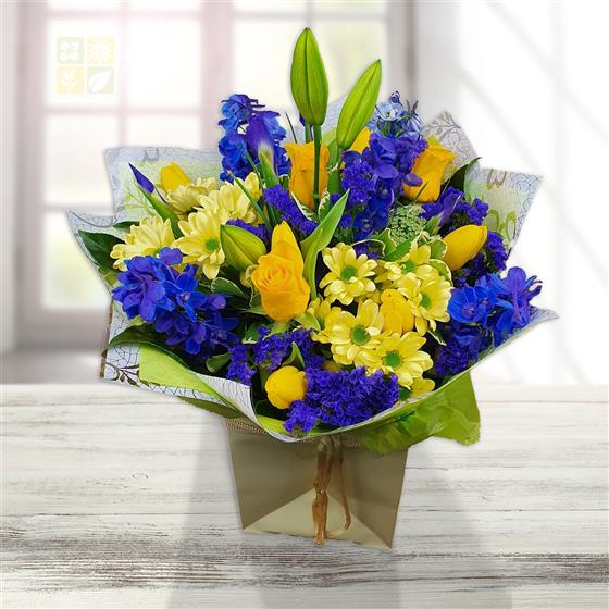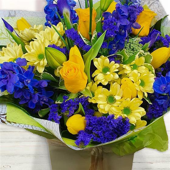 Design includes yellow roses, yellow chrysanthemum blooms, blue delphinium, lilac statice, unopened lily buds and fresh green foliage, arranged into a bright bouquet with crisp colour contrast, height and a clean, uplifting feel.