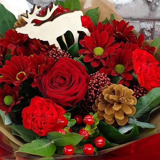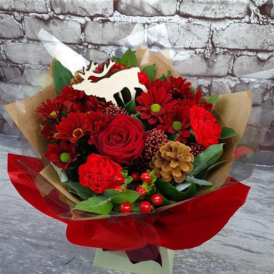 A rich festive arrangement bursting with red roses, carnations, winter chrysanthemums, berries and fresh seasonal foliage. Finished with a rustic pinecone and a charming reindeer accent, it brings a warm Christmas feeling to any home. We will prepare your flowers fresh and with care, ready for delivery.